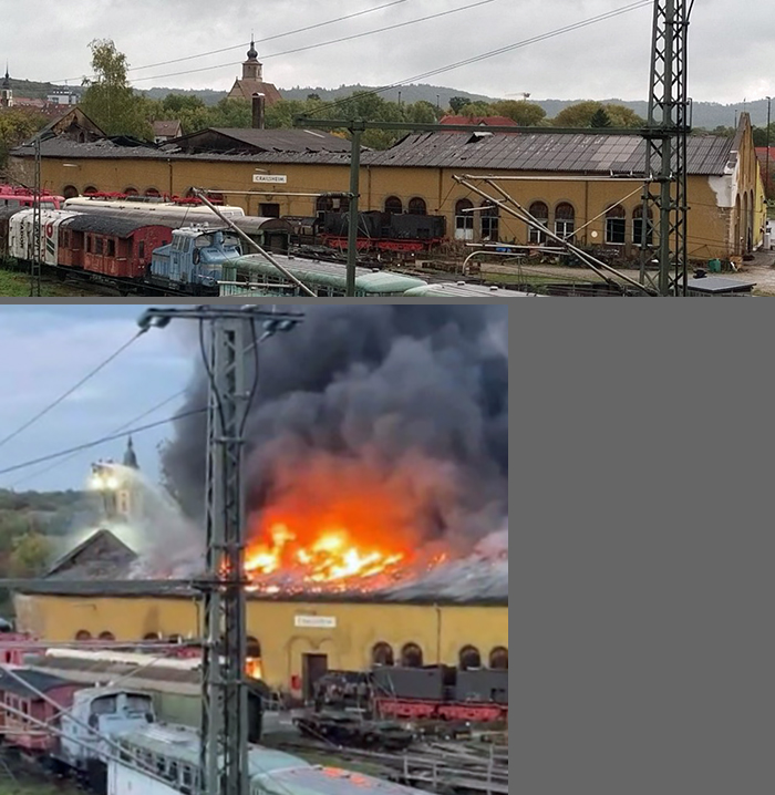 Aktuell laufen die Brandermittlungen, sodass wir euch zur Ursache des Feuers noch keine neuen Informationen geben können. Zum Zeitpunkt des Feuers standen neben zwei Wagen fremder Eigentümer, an denen durch die private Firma GfF Instandsetzungsarbeiten durchgeführt wurden, auch die in Aufarbeitung befindliche 50 3606 unseres Muttervereins DBK Historische Bahn e.V. in der Halle. Soweit wir es aktuell überblicken können, scheint die Dampflok einen großen Schutzengel gehabt zu haben und nur geringe Schäden davonzutragen.